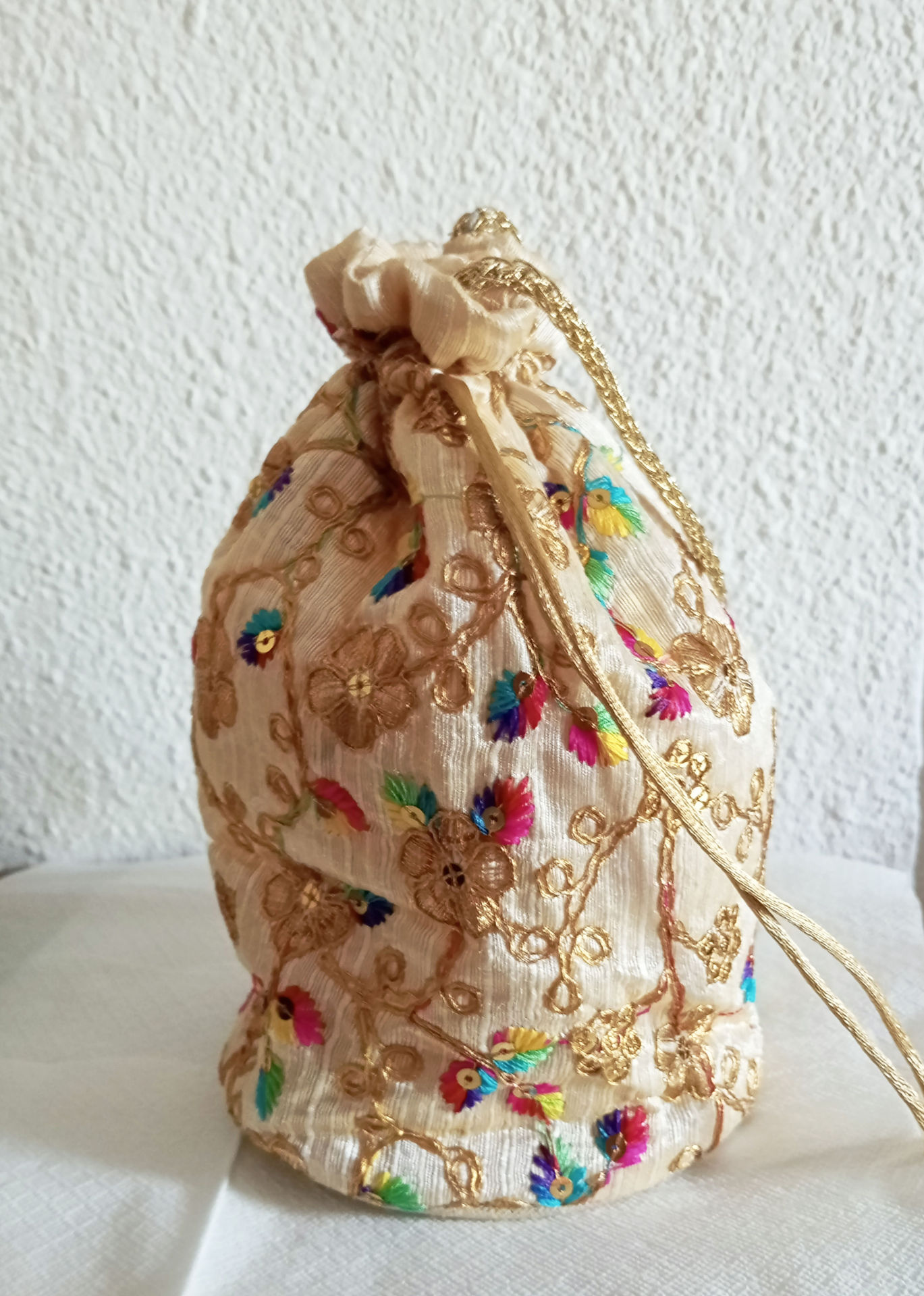 Bolso en forma de saco o limosnera de absoluta tendencia. Con asa para colgar. Tela preciosa bordada.
